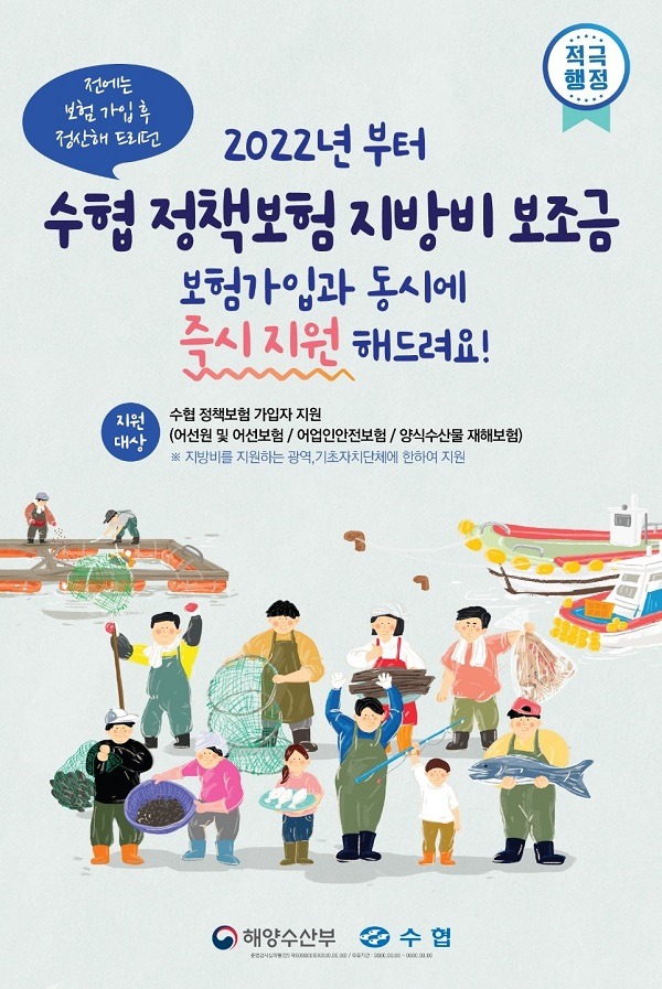 이종호 해수부 소득복지과장은 “국가와 지자체 지원금이 동시 지급됨에 따라 현장 어업인들이 더 편리하게 보험에 가입할 수 있게 될 것으로 기대되고, 앞으로 지자체와의 지속적인 정보공유와 협력을 통해 어업인들에게 더 많은 혜택이 돌아갈 수 있도록 노력하겠다”고 말했다.