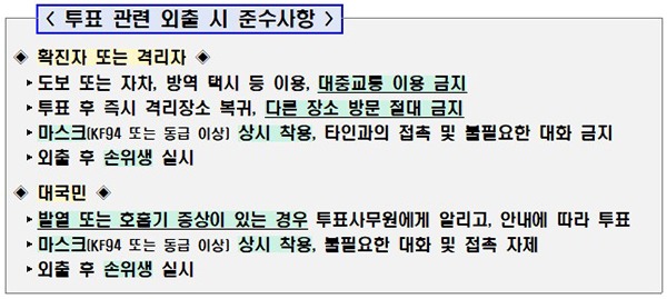아울러 투표 후 다른 장소를 방문하지 말고 즉시 격리장소로 복귀해야 하며, 외출 후 물과 비누 또는 손세정제·손소독제를 이용해 손위생을 실시해야 한다.