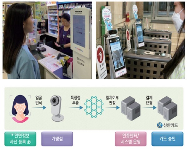 신한카드는 2019년 8월 1일부터 신한카드 본사 식당 및 카페, 편의점 CU에서 시범 운영 후 2020년 4월 한양대학교 내 학생식당, 편의점 등에서 첫 상용화를 시작했다. 같은해 10월에는 얼굴 인식만으로 무인편의점 출입과 결제가 가능한 서비스를 CU한양대생활관점에 시범 도입하기도 했다. 신한카드의 안면인식 결제 서비스로 지난해까지 총 5000여건의 결제가 이뤄졌다.