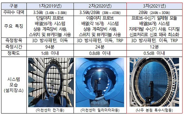 이번 시스템의 개발 경과를 보면 2019년 1차 연도 때는 3.5㎓ 대역 측정 시스템을, 이듬해인 2020년 2차 연도에는 3.5㎓/28㎓ 이중 주파수대역 측정 시스템을 개발해 시간을 단축했다.