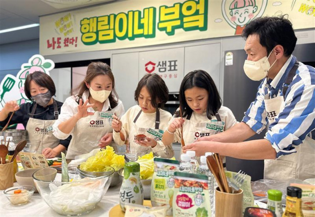 쿠킹클래스에 참여하는 가정에는 새미네부엌 김치 양념(겉절이·물김치)과 요리에센스 연두, 쌀소면 등 샘표 제품과 농산물 구독 플랫폼 예스어스(YESUS)의 친환경 배추와 무가 미리 전달됐다.