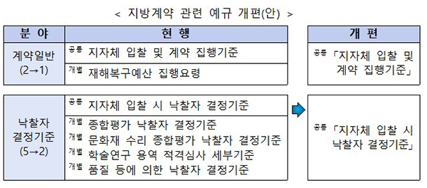 이에 복잡한 지방계약 예규 체계를 전면 개편, 7개의 예규를 2개로 통폐합하고 계약목적물별로 중복 규정된 내용과 서식 등을 대폭 정비하고 간소화했다.