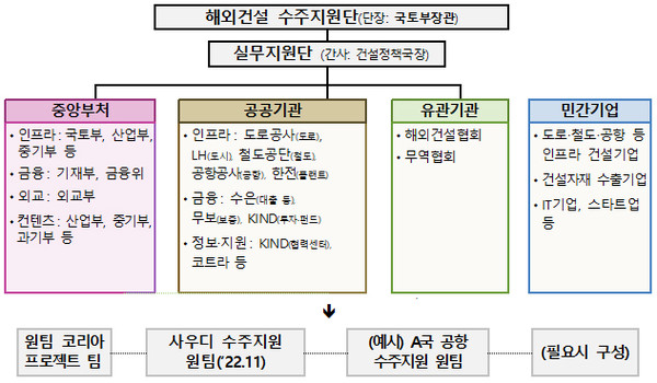 원희룡 국토부 장관을 단장으로 하는 수주지원단은 산업통상자원부, 중소벤처기업부, 기획재정부, 외교부 등 관계 부처와 한국토지주택공사(LH) 등 공공기관, 해외건설협회 등 유관기관, 산업계가 모두 참여한다.