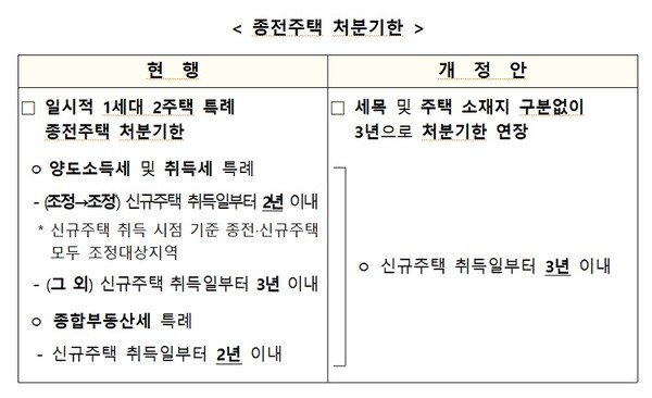 일시적 2주택 특례 제도는 1세대가 1주택을 보유하면서 이사 등을 위해 신규주택을 취득해 일시적으로 1세대 2주택이 된 경우, 종전주택을 처분기한 내 양도하면 양도세·취득세·종부세 관련 1세대 1주택 혜택을 적용하는 제도이다. 지금까지 종전주택 처분기한은 신규주택 취득일부터 2년 이내였다.