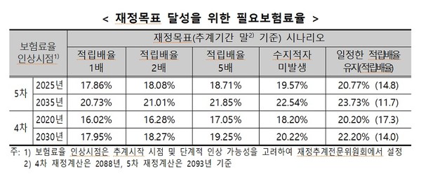 이에따라 재정추위는 국민연금 재정 안정화를 위한 필요 보험료율도 함께 제시했다. 5차 재정계산의 경우 적립기금 규모에 대한 목표 시나리오별 필요보험료율을 4차 재정계산 때보다 약 1.66%p~1.84%p까지 높게 잡았다.