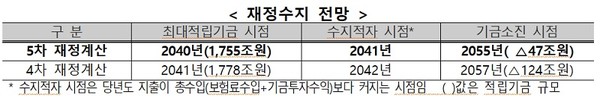 직전인 2018년 4차 재정계산 결과와 비교해 보면 수지적자 시점은 1년, 기금소진 시점은 2년 당겨졌다. 적립기금 최대치 규모도 4차 때의 1778조원에서 1775원으로 다소 줄었다.