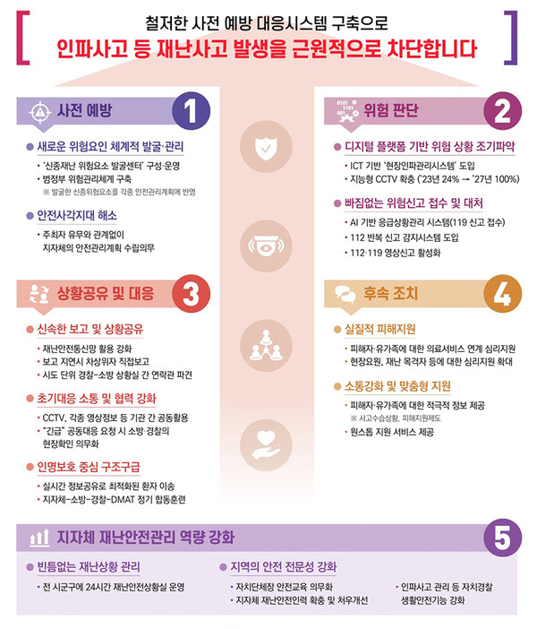 범정부 차원에서 새로운 위험을 예측하고 상시 발굴해 체계적으로 예방하고 대비하는 선제적 재난안전관리체계를 운영한다.
