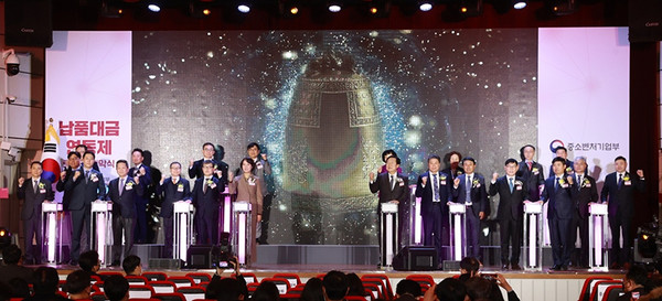 이영 중소벤처기업부 장관(앞줄 왼쪽에서 여섯 번째)이 8일 서울 서초구 KT 우면 연구센터에서 열린 ‘납품대금 연동제 로드쇼 개막식’에서 기념 세리머니를 하고 있다. [사진=중소벤처기업부]