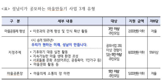 <표> 성남시가 공모하는 마을만들기 사업 3개 유형