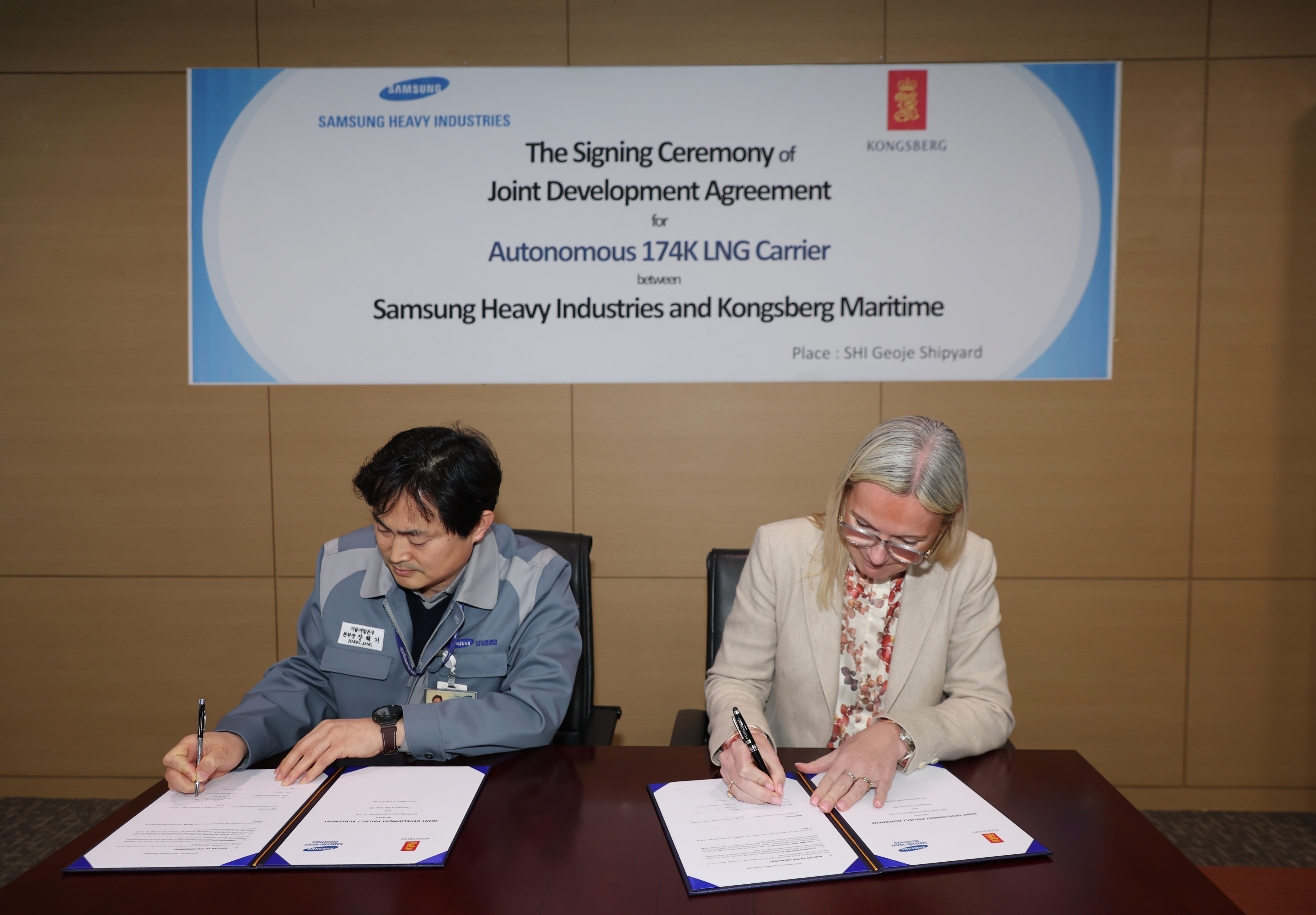 삼성중공업은 노르웨이 '콩스버그'(Kongsberg Maritime AS)社와 자율운항선박 개발을 위한 공동 개발 프로젝트 협약(JDA)을 체결했다고 20일 밝혔다.