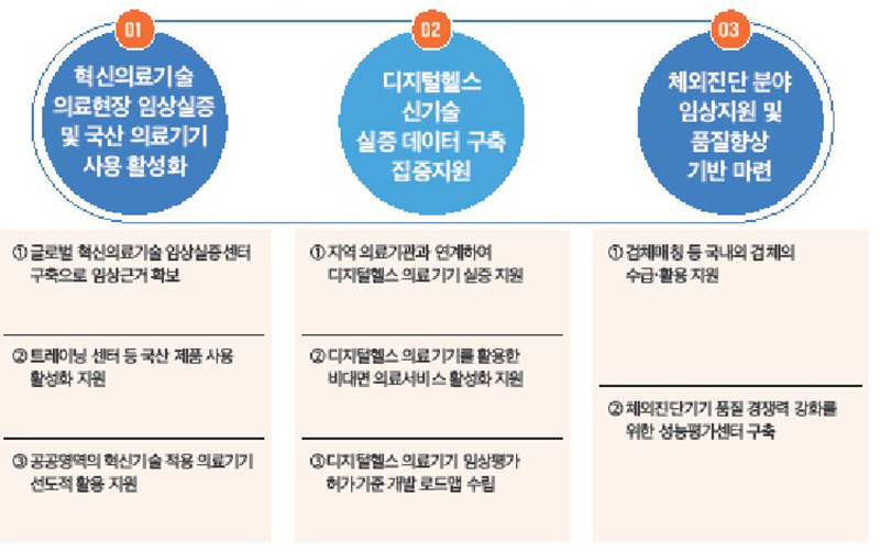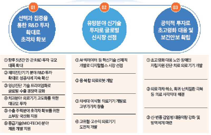 체외진단, 영상진단, 치과 등 주력분야 역량 강화와 함께 디지털헬스 등 유망 분야 연구개발 투자를 확대해 수출 5대 강국 도약 기반을 마련한다.