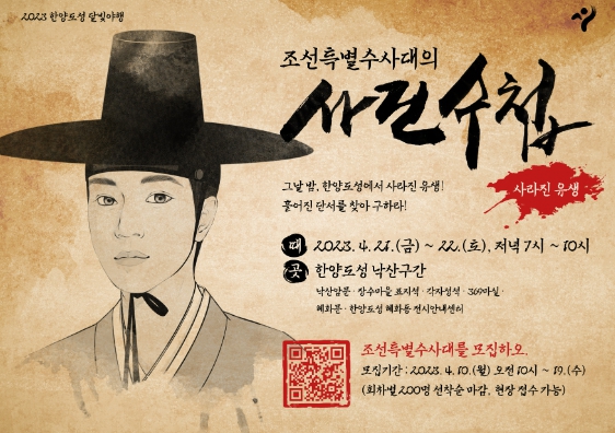 서울시는 4.21일부터 4.22일까지 양일간, 한양도성 낙산구간에서 ‘2023 한양도성 달빛야행’ 행사를 개최한다. 올해 ‘한양도성 달빛야행’은 시민들이 직접 ‘조선특별수사대’의 수사대원이 되어 사라진 유생을 찾는, ‘추리게임형’ 미션 투어인『조선특별수사대의 사건수첩 - 사라진 유생』으로 운영된다. 오는 4.10일 오전 10시부터 달빛야행에 참여할 선착순 800명의 시민을 모집한다.