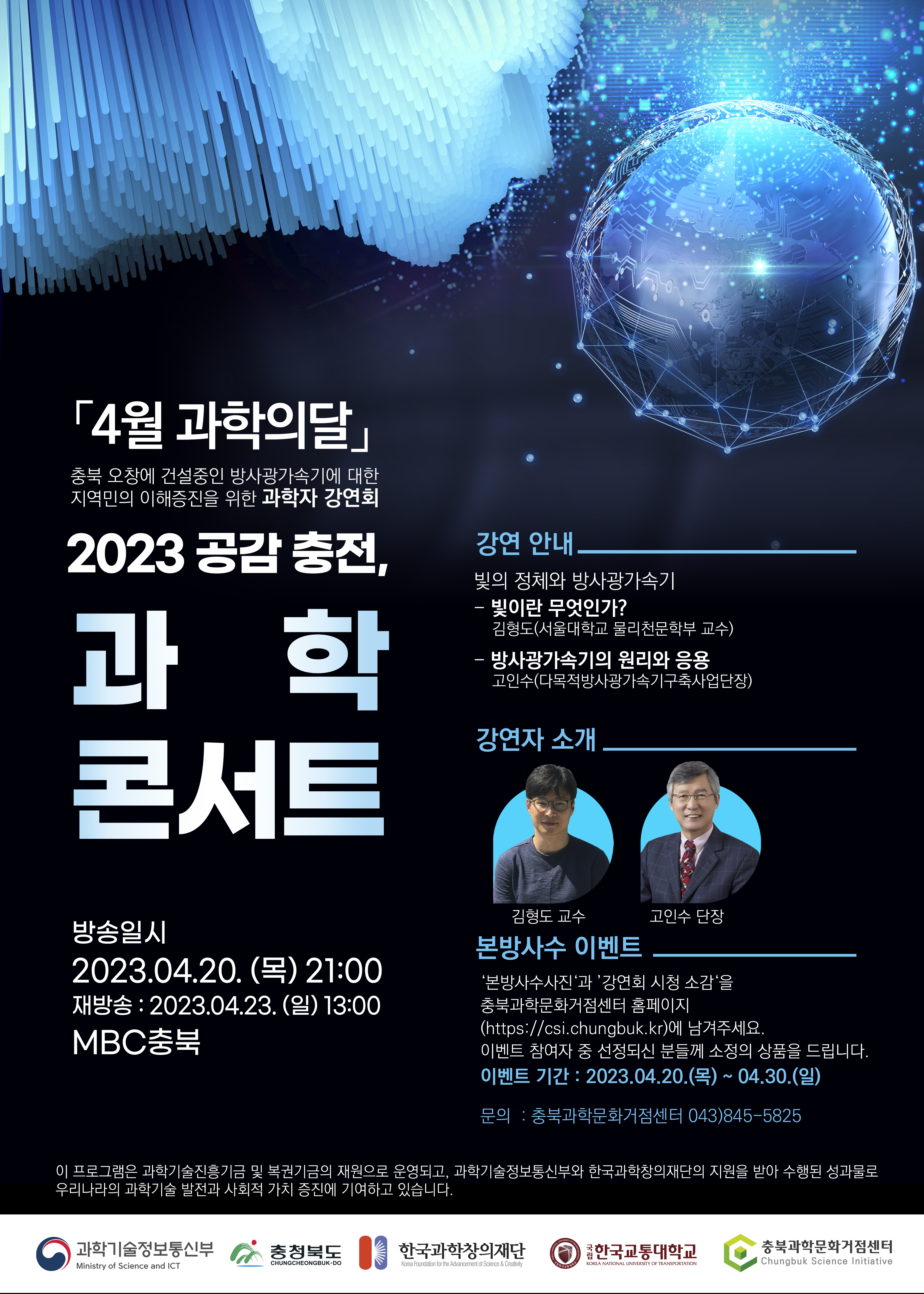 충청북도와 충북과학문화거점센터는 ‘4월 과학의 달’을 맞이하여 청주 오창에 건설 중인 방사광가속기에 대한 지역민의 이해증진을 위한『공감충전, 과학콘서트(주제: 빛의 정체와 방사광가속기)』를 개최한다.