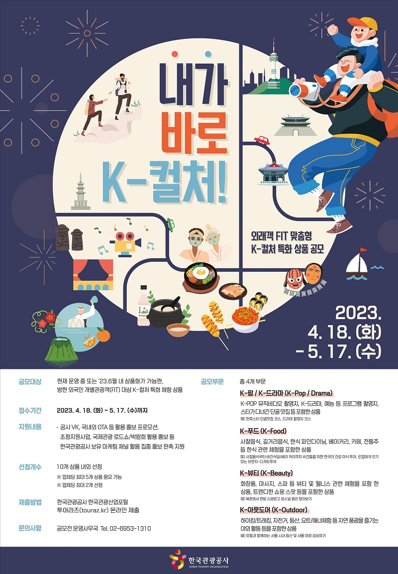공모전에서는 K-푸드, K-뷰티·패션, K-팝·드라마, K-아웃도어 등 4개 부문에서 오는 6월 안에 출시가 가능한 외국인 대상 관광상품을 찾는다.