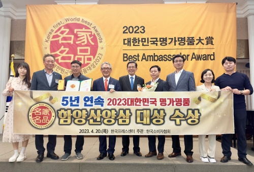 경남 함양군의 특산물인 '함양 산양삼'이 20일 오후 2시 30분 서울시 중구 한국프레스센터에서 열린 '2023 대한민국 명가명품대상' 지역명품브랜드 부문에서 5년 연속 대상을 수상했다.
