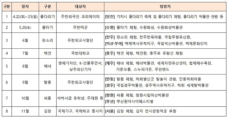 예정된 프로그램은 ▲국방대학교 해외 무관을 대상으로 하는 충주 택견 체험(7월) ▲주한 외국인 인플루언서, 상주 외신기자를 대상으로 하는 제주 해녀 체험(8월) ▲주한 외교사절단을 대상으로 하는 안동하회마을 답사와 하회별신굿 탈놀이 공연 관람(9월) 등이다.