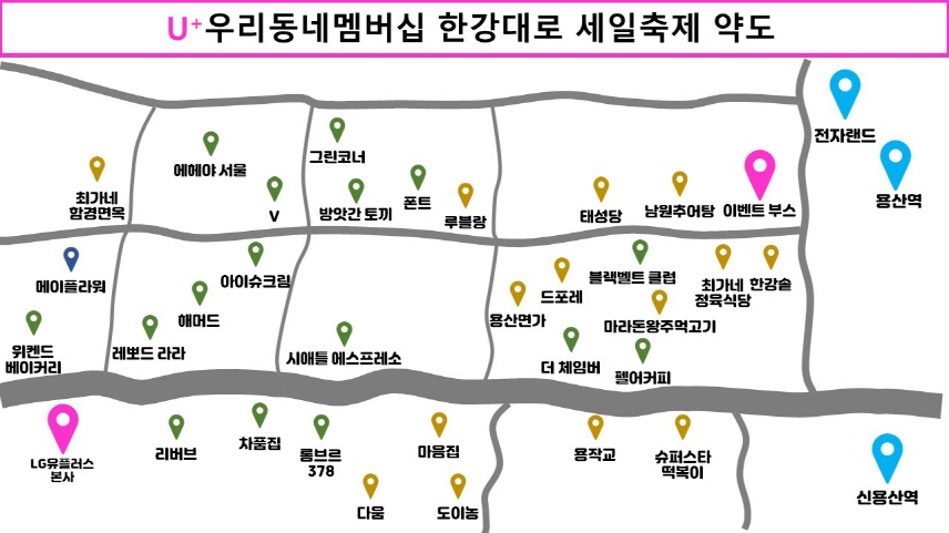 LG유플러스는 골목상권 활성화와 멤버십 이용 경혐 혁신을 위해 U+모바일 고객에게 제휴처 할인 혜택을 제공하는 ‘U+우리동네멤버십-용산 한강대로편’을 진행한다.