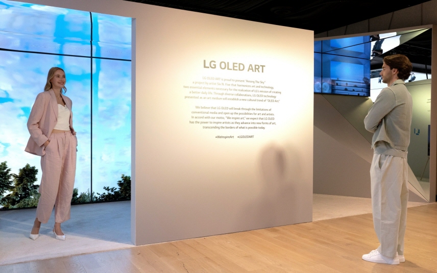 LG전자는 작가와 협업해 작품 감상을 위한 최적의 공간을 조성했다. 하늘이 훤히 보이는 유리 천장과 노출 콘크리트 벽에 창문처럼 전시된 올레드 TV 등을 통해 관람객은 작품과 실제 하늘을 동시에 감상하며 즐길 수 있다.