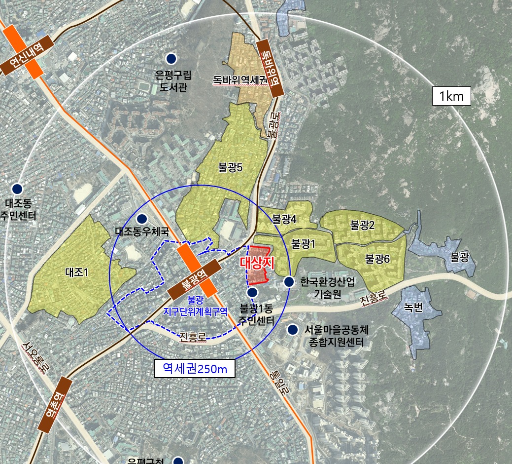 대상지는 3호선·6호선 불광역으로부터 250m 이내에 위치해 지하철이용이 매우 편리한 입지다. 하지만, 좁은 일방통행로와 막다른 도로로 차량 진입이 불가능해 역세권이라는 잠재력에도 불구하고 주거환경이 열악한 곳이다. 서울시는 대상지의 잠재력과 대지의 여건을 극복한 재개발 정비 방향을 제시했다.