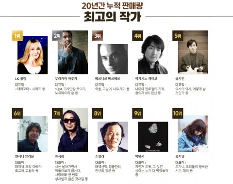 인터넷 서점 알라딘은 7월 서비스 오픈 20주년을 맞아 20년간 가장 높은 판매량을 올린 책·작가·아티스트 등을 공개했다. 그 결과 <해리포터> 시리즈의 J.K.롤링이 20년간 가장 높은 누적 판매량 기록을 세운 작가인 것으로 나타났다. 2위는 <노르웨이의 숲>, <1Q84> 등을 집필한 무라카미 하루키가, 3위는 <개미>, <죽음> 등을 집필한 베르나르 베르베르가 차지했다. 이어 히가시노 게이고, 유시민, 앤서니 브라운, 류시화, 조정래, 박완서, 공지영 등이 3~10위에 랭크된 것으로 나타났다.