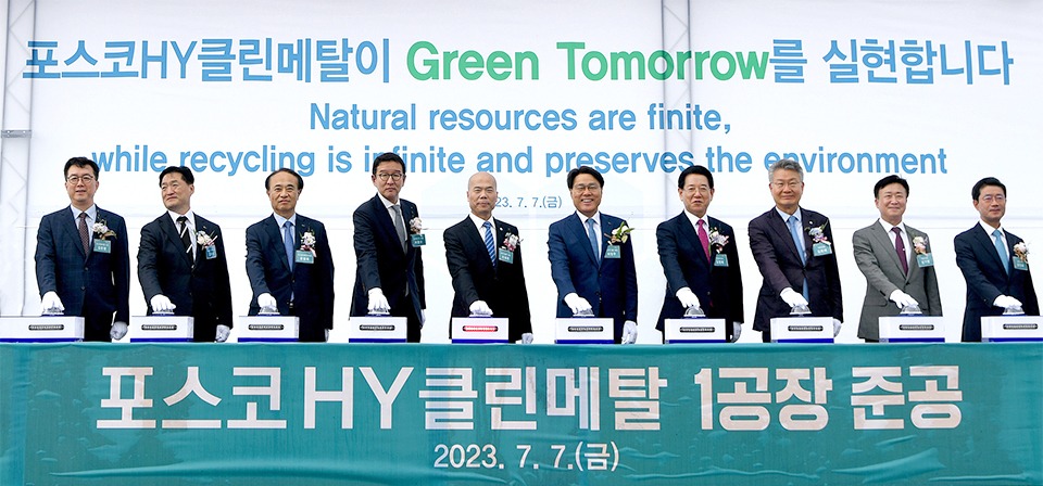 7일 전라남도 율촌산업단지에서 열린 포스코HY클린메탈 이차전지 리사이클링 공장 준공식에는 최정우 포스코그룹 회장, 김영록 전남도지사, 김회재 국회의원, 정기명 여수시장, 정인화 광양시장, 천쉐화 화유코발트 회장, 허용수 GS에너지 사장 등이 참석했다.