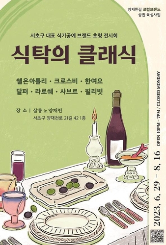 전시는 '양재천천마켙'에서 발굴한 서초구 신진작가인 테이블웨어 브랜드 '쉘 온 아틀리', 도자기 브랜드 '한여요'와 상권 내 친환경 와인 브랜드 '크로스비', 커트러리와 테이블웨어 브랜드 '달퍼', '라로쉐', '사브르', '필리빗' 등 총 7개 업체가 참여해 100여 점의 공예품을 전시·판매한다.