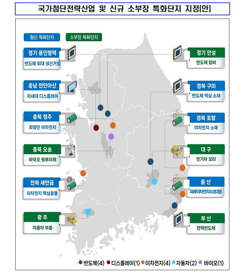 소부장 특화단지는 이날 열린 소부장경쟁력강화위원회에서 경기 안성, 충북 오송, 광주, 대구, 부산 5곳을 신규로 지정함에 따라 총 10개 단지로 늘어났다.