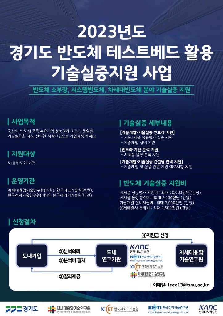 경기도와 차세대융합기술연구원(이하 융기원)이 ‘경기도 반도체 테스트베드 활용 기술 실증 지원사업’에 참여할 신규지원 대상 기업을 공모한다.