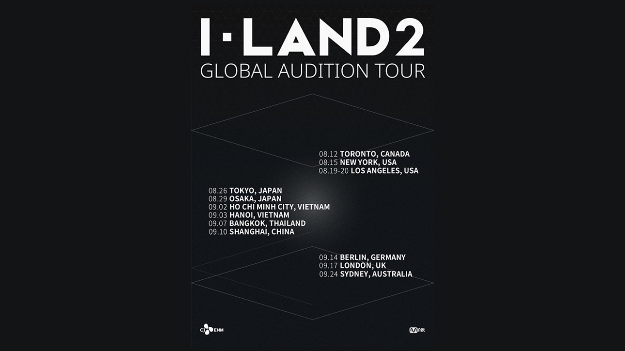 <아이랜드2>는 온라인 모집과 별개로 금번 글로벌 오디션 투어를 통해 오프라인 현장 심사를 병행한다. 서류 지원과 현장 오디션을 투트랙으로 진행함으로써 무한한 가능성으로 판을 깨는 새로운 모험의 여정을 함께할 지원자들을 발굴하겠다는 의지를 전한 것. <아이랜드2>의 글로벌 오디션 투어는 오는 8월 12일 캐나다 토론토를 시작으로 15일 미국 뉴욕, 19일과 20일 미국 로스앤젤레스, 26일 일본 도쿄, 29일 일본 오사카, 9월 2일 베트남 호치민, 3일 베트남 하노이, 7일 태국 방콕, 10일 중국 상하이, 14일 독일 베를린, 17일 영국 런던, 24일 호주 시드니까지 총 9개국 12개 도시에서 개최된다. 세부 내용은 프로그램 홈페이지( www.i-land2.com)를 통해 확인할 수 있다.