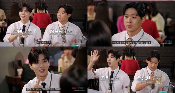 진원과 정승원은 훈훈한 MZ회사원으로 등장해 자연스러운 연기를 펼쳤으며, 댄디한 룩의 셔츠핏을 자랑하며 빛나는 비주얼로 이목을 끌었다.