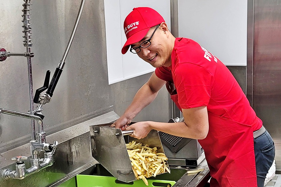 ≫ 지난 4월 김동선 전략본부장이 홍콩 파이브가이즈 매장 주방에서 조리 실습을 하고 있다.