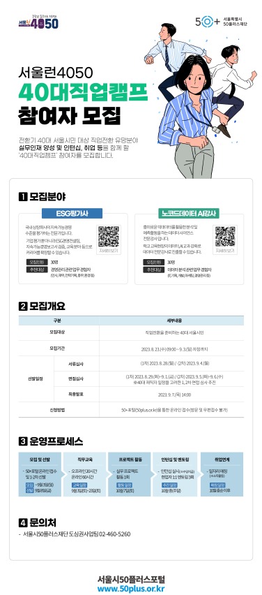 재취업을 준비하고 있는 40대는 누구나 직업캠프에 참여할 수 있으며, 23일(수)부터 50+포털(50plus.or.kr)을 통해 참여 신청할 수 있다.