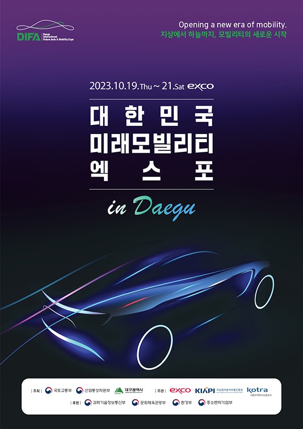 미래모빌리티 분야 전문 전시회인 ‘2023 대한민국 미래모빌리티엑스포(이하 2023 DIFA)’가 10월 19일(목)부터 21일(토)까지 사흘간 엑스코에서 열린다.
