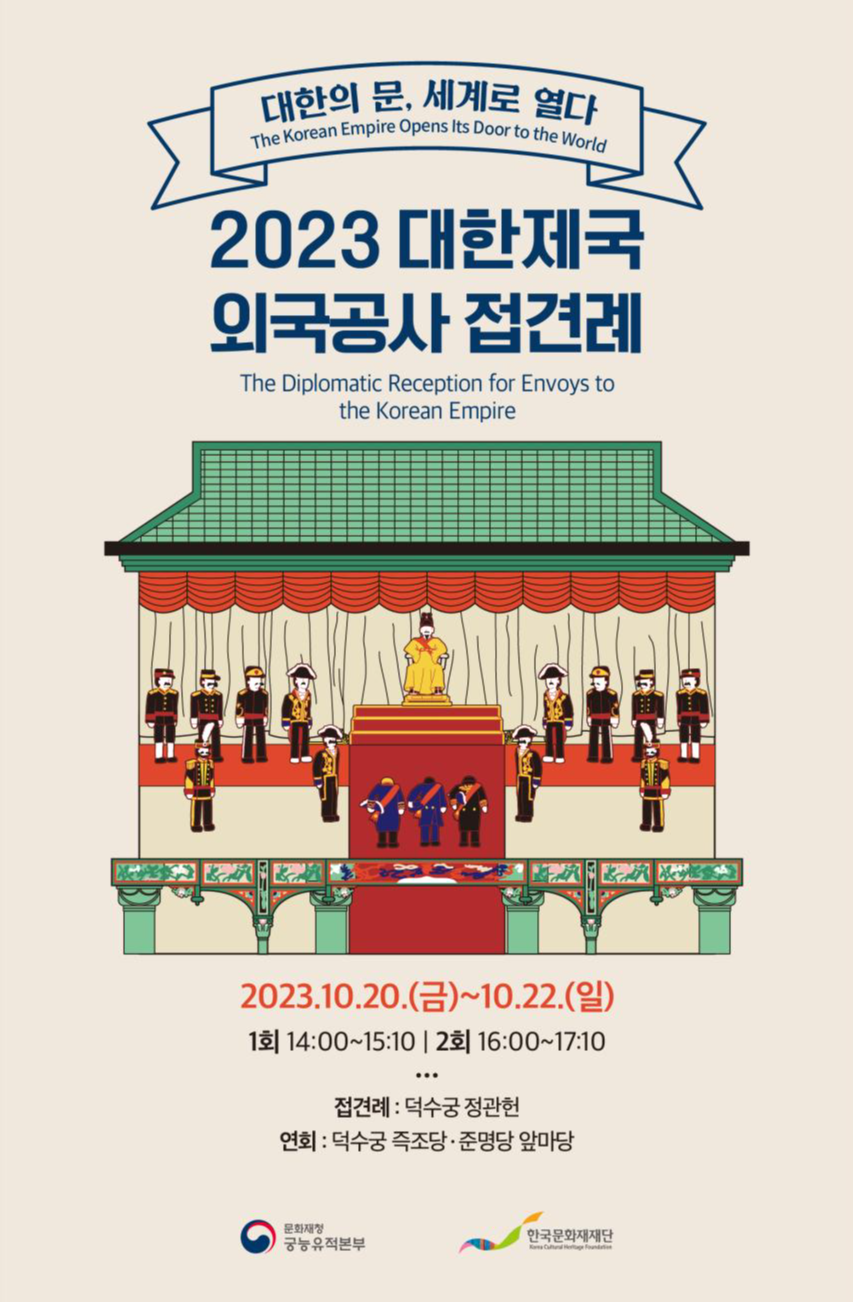 문화재청 궁능유적본부는 한국문화재재단과 오는 20일부터 22일까지 3일간 덕수궁(서울 중구)에서 대한제국 당시 고종 황제가 각국의 공사를 접견하는 의례와 이를 축하하는 연회를 생동감 있게 재현한 ‘2023 대한제국 외국공사 접견례 – 대한의 문, 세계로 열다’ 행사를 개최한다.