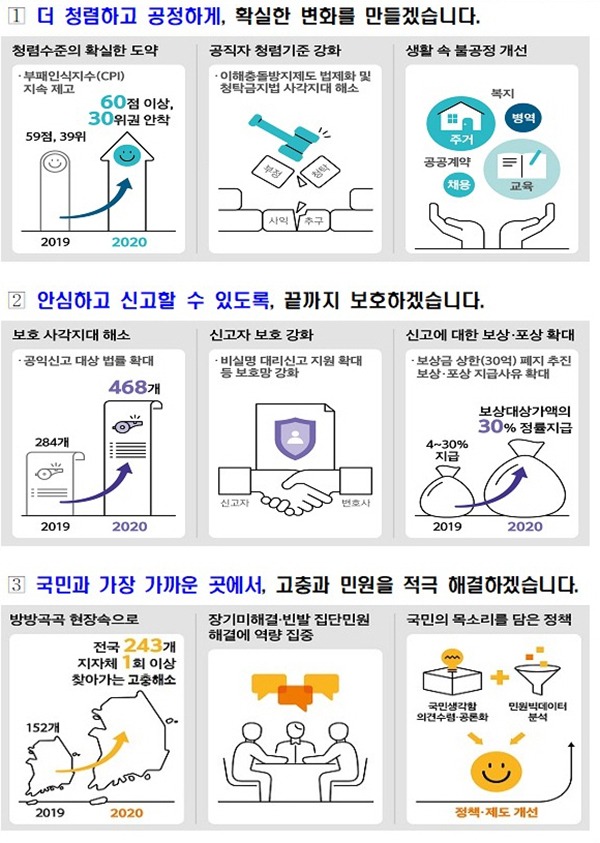 국민권익위는 이날 업무계획에서 “그동안의 반부패 개혁 추진 결과, 우리나라의 부패인식지수(CPI)가 지속적으로 상승해 지난해는 역대 최고수준(59점, 39위/180개 국가)을 기록했다”며 “유럽반부패국가역량연구센터(ERCAS)의 공공청렴지수(IPI)도 아시아 국가 중 1위(19위/117개 국가)를 차지하는 등 우리 반부패·청렴 수준에 대한 인식과 평가가 크게 개선되었다”고 설명했다.