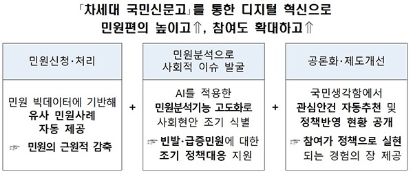 먼저 국민신문고에 지능정보기술(AI)을 적용해 민원신청 단계부터 유사 민원사례를 자동 제공하여 단순한 불편이나 궁금사항은 즉시 해결한다. 처리부서도 민원담당자가 아닌 국민신문고 시스템이 자동으로 추천·배정해 민원 처리의 신속성을 높인다.