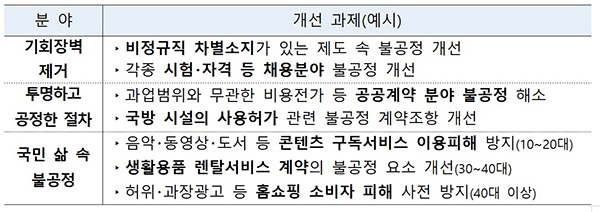불공정한 사규 등 공공기관 내부규정도 전수 점검해 개선하는데, 올해부터 3년동안 491개 공직유관단체를 대상으로 인사 및 공공계약 등 주요 업무 과정에서 직권·재량 남용 가능성이 있는 불공정한 규정을 샅샅이 찾아 집중 개선할 방침이다.