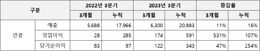 3분기 누적 매출은 2조 883억 원, 영업이익은 591억 원으로, 작년 동일 기간과 비교해 각각 16%, 107% 개선됐다. 당기순이익은 343억 원으로 전년 97억 원에서 254% 증가한 성과다.