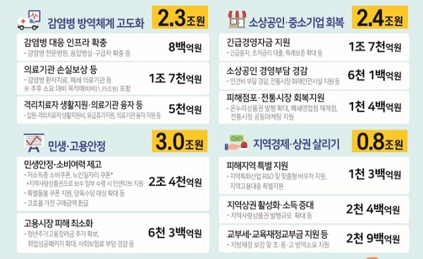 세출에서는 코로나 19 피해극복에 꼭 필요한 ▲감염병 방역체계 고도화 2조3000억원 ▲소상공인·중소기업 회복 2조4000억원 ▲민생·고용안정 3조원 ▲지역경제·상권살리기 8000억원을 반영했다. 이는 세출 확대분의 70% 이상이 소비 등 내수 되살리기에 투입되는 셈이다.
