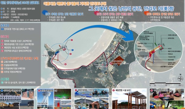 올해 어촌뉴딜 300사업 대상지로 선정된 만리포항은 서해안 3대 해수욕장 중 하나인 만리포 해수욕장과 인접하고 빼어난 해상 경관과 편리한 교통, 호텔‧여관 등 숙박시설이 잘 갖추어져 매년 많은 관광객이 찾는 곳이다.