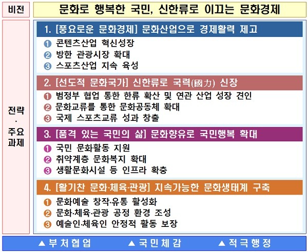 올해 문체부는 ▲신한류의 확산 ▲관광산업 역량 강화 ▲2020 도쿄올림픽 등 국제 스포츠교류 성과 창출 ▲국민의 다양한 문화·여가 활동 지원 ▲영화·예술·스포츠 분야 등의 공정 환경 조성 등을 중점 추진한다.