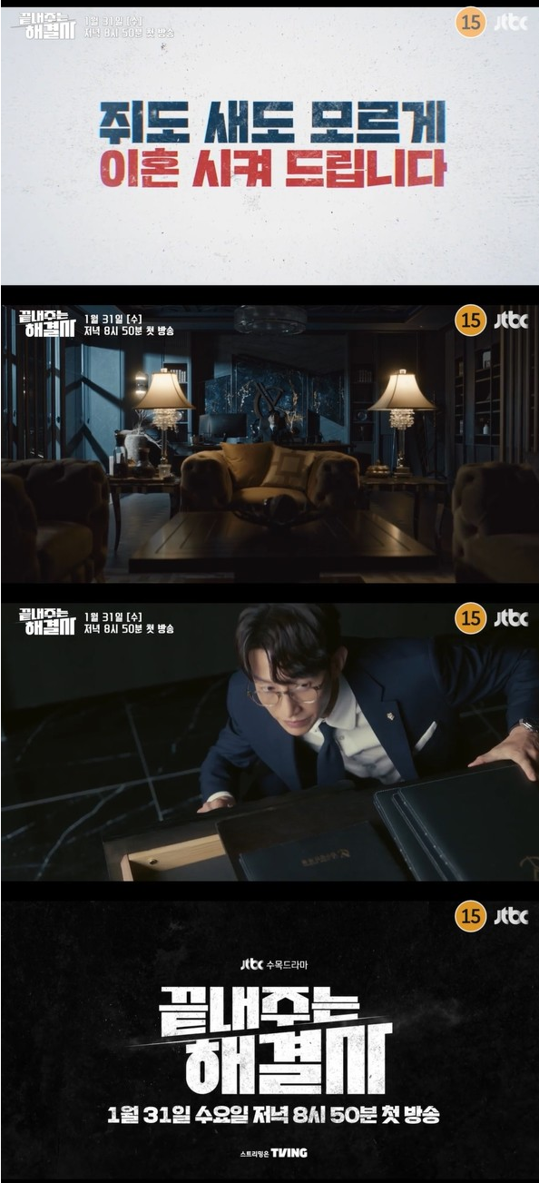 오는 31일(수) 첫 방송될 JTBC 새 수목드라마 ‘끝내주는 해결사’(극본 정희선/ 연출 박진석/ 제작 하우픽쳐스, 드라마하우스, SLL)에서 2차 티저 영상을 공개(https://naver.me/FcuVjETn), 악질 배우자들을 처단할 약점을 찾는 솔루션 팀의 화끈한 한 방을 예고하며 기대감을 높이고 있다.