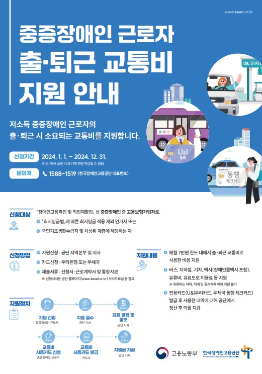 고용노동부와 한국장애인고용공단은 2024년 1월부터 중증장애인 근로자 출·퇴근 교통비 지원을 기존 매월 5만 원에서 7만 원으로 인상했다.