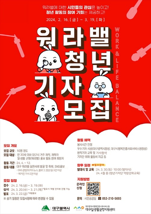 대구광역시는 청년 인재 유출을 방지하고 저출생을 극복할 수 있는 ‘청년 정착 워라밸 도시 대구’를 실현하기 위해 2월 16일(금)부터 3월 19일(화)까지 지역 청년을 대상으로 ‘워라밸 청년기자단’ 12기를 모집한다.