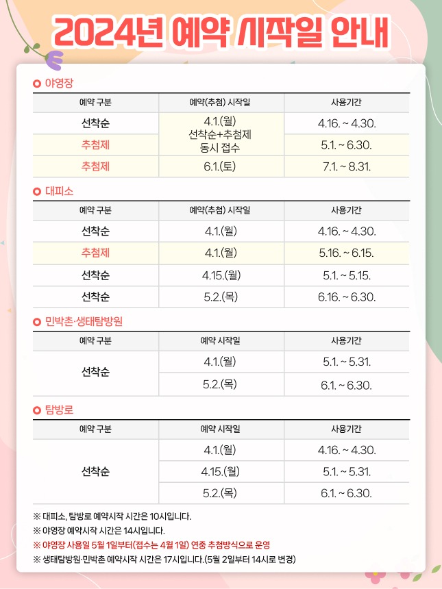 국립공원 야영장 예약에 대한 자세한 사항은 국립공원 예약시스템(reservation.knps.or.kr) 알림마당 게시판에서 확인할 수 있다.