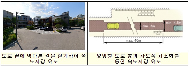 주거지, 어린이보호구간 등에서 차량보다 보행자가 우선인 도로환경을 조성하기 위해 운전자가 자연스럽게 차량속도를 15km/h 이하로 저감할 수 있는 도로설계 기법을 새롭게 도입한다.