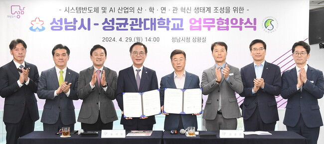 성남시는 29 일 오후 2 시 성남시청 상황실에서 신상진 성남시장과 유지범 성균 관 대학교 총장이 참석한 가운데 해당 내용을 담은 시스템반도체 및 AI 산업의 산 ‧ 학 ‧ 연 ‧ 관 혁신 생태계 조성을 위한 업무협약을 체결했다 .