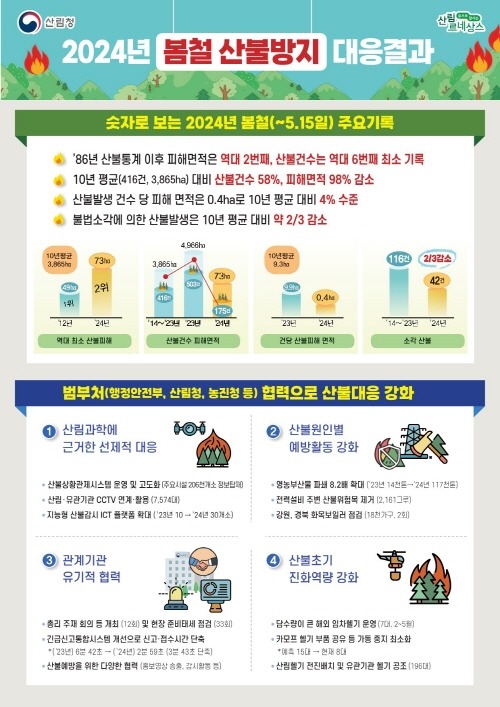 아울러 행정안전부와 산림청은 산불 신고(112·119)내용이 신고 즉시 산림청으로 전달되도록 ‘긴급신고통합시스템’을 개선해 산불신고·접수시간을 평균 3분 이상 단축했으며 산림청은 유관기관 감시카메라 7,574대를 활용해 신속하게 산불에 초동 대응할 수 있도록 했다.