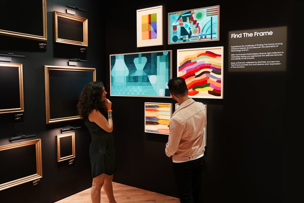 삼성전자의 디지털 아트 구독 서비스 ‘아트 스토어’의 다양한 작품들이 전시 되는 ‘하이라이트 존’과 실제 작품 액자들 사이에 숨겨진 더 프레임을 발견하는 재미를 느낄 수 있는 ‘파인드 더 프레임 존’도 마련했다.