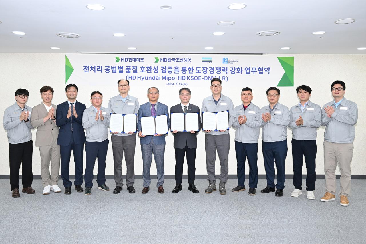 HD현대 조선 계열사인 HD현대미포는 17일 울산 본사에서 HD한국조선해양, DNV(노르웨이 선급), LR(영국 로이드선급)과 ‘전처리 공법 품질검증을 통한 도장경쟁력 강화 업무협약(MOU)’을 체결했다.